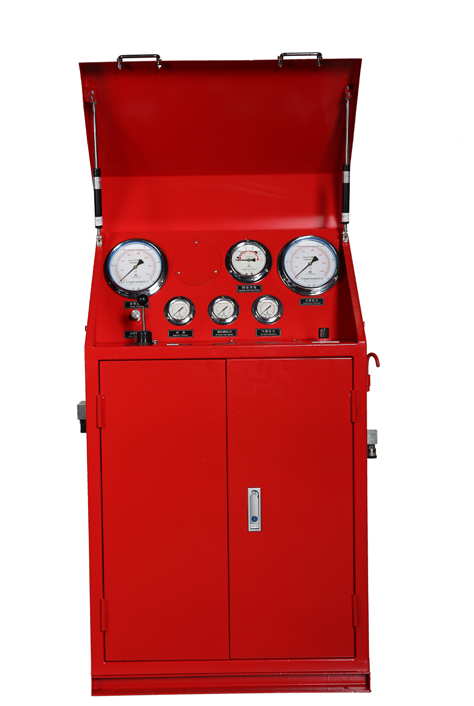 液控箱安装在钻井平台上,可以遥控液动节流管汇上的液动节流阀。控制箱面板上装有立压表、套压表、阀位开度表、油压表、气压表、三位四通手动换向阀。